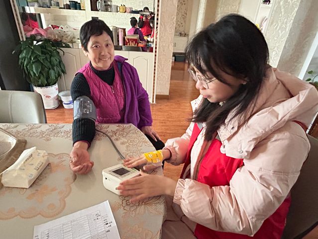 活动中,志愿者分组走访社区老人,开展家庭药箱检查和血压测量服务。在药箱检查环节,志愿者逐一核对药品生产日期和保质期,并向老人讲解合理用药和科学服药方法。随后为老人测量血压,操作过程中,志愿者还向老人普及日常血压监测知识及健康生活方式建议。活动期间,志愿者与社区老人亲切交流,现场气氛融洽。