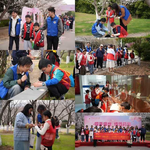上午9时,青少年们沿樱花大道开启春日研学之旅。在落英缤纷的樱花苑,志愿者以飘落花瓣为教具,指导孩子们制作中药标本书签,在樱花祈愿树共同悬挂成长心愿卡。转入药用植物园后,在讲解员的带领下,研学团队在徐国钧院士雕像前驻足瞻仰,感悟科学家精神,系统认知薄荷、连翘等植物的药用价值,倾听药大于镇坪结对帮扶所建立起的深厚友谊,依托馆藏资源开展动植物标本感官实践教学,构建起“生态美育-专业认知-实践探究”多维立体的教学场域。