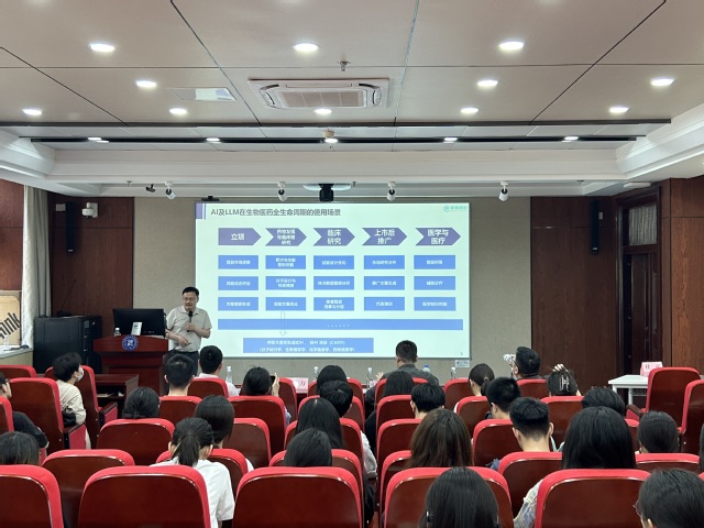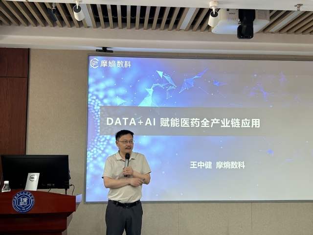 报告中,王中健博士围绕AI技术在医疗健康领域的多元化应用进行了深入讲解,重点阐述了数据与数据分析在医药研发和产业链协同中的核心价值,系统介绍了当前AI大模型的研究进展及其在药物开发、疾病诊断和医疗管理等方面的实践案例。王博士结合摩熵数科在“数据+AI”模式下的实际经验,为在场师生展示了AI赋能医药产业的广阔前景。