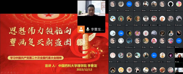 12月12日下午,李曹龙副经理为联系党、团支部宣讲中国共产党第二十次全国代表大会精神,williamhill药物分析研究生党支部和2022级信管一班本科生团支部全体成员参加。