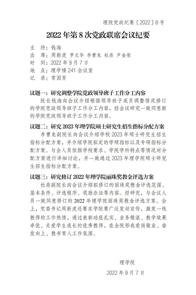 2022年第8次党政联席会议纪要