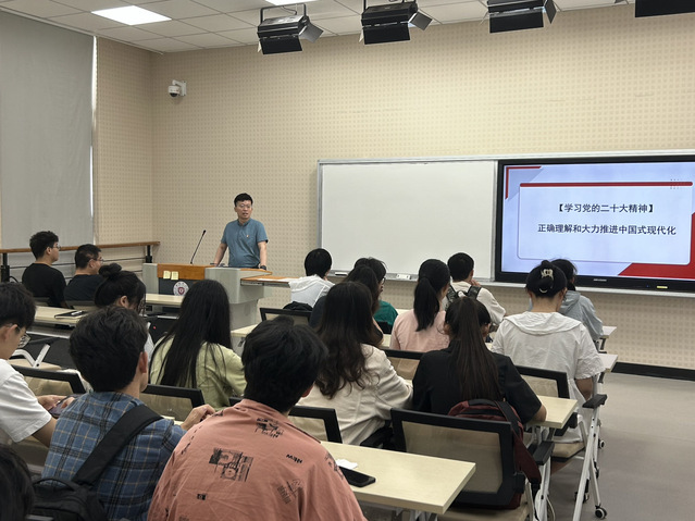 周新虎书记以“学习党的二十大精神——正确理解、大力推进中国式现代化”为主题,先是带领同学们回顾了党的百年奋斗史,以史为鉴深刻阐释了新时代新青年的使命与担当。接下来,他带领大家回顾党的二十大报告中有关中国式现代化的论述,围绕中国式现代化的历程、中国式现代化的重要特征、中国式现代化理论的重大创新、推进中国式现代化必须把握的重大原则和重大关系等方面进行了系统阐述。周书记强调,作为新时代青年要听党话、跟党走,对中国式现代化要知其然、知其所以然、知其所以必然,深刻理解中国式现代化的中国特色,以自身专业为依托,努力拼搏、不懈奋斗,在以中国式现代化全面推进中华民族伟大复兴的新征程上贡献自己的力量。