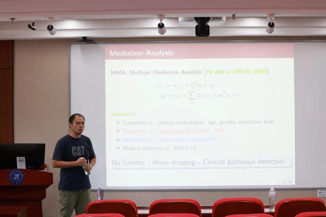 黄超博士以“当中介分析面临多层次异质性”为题,从背景、基于中介分析的影像遗传学、模型构建、总结及展望等方面进行详细介绍。黄超博士把遗传标记、大脑结构变化和疾病产生的三角关系作为切入点,把处理多层次异质性的同时进行基于影像遗传学的中介分析作为目标,对阿尔兹海默症病人的相关数据进行了系统记录、整理、分析。黄超博士通过运用了大量数据、图像和公式,为与会师生作了直观的介绍和深刻的分析,深化了对该领域全面而系统的认识。报告内容精彩,深入浅出,大家受益匪浅。最后,报告在师生们的热烈掌声中结束。