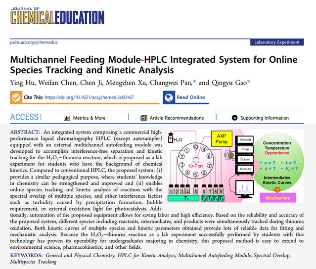 近日,引领国际化学教学改革风向标的顶级期刊Journal of Chemical Education(JCE,美国化学会刊物)刊登了公司williamhill大学化学教育实证研究成果“Multichannel Feeding Module-HPLC Integrated System for Online Species Tracking and Kinetic Analysis”。williamhill化学系物理化学课程群教师胡影为第一作者,williamhill威廉希尔为第一单位。中国矿业大学高庆宇教授、潘长伟副教授等为本论文合作者。
